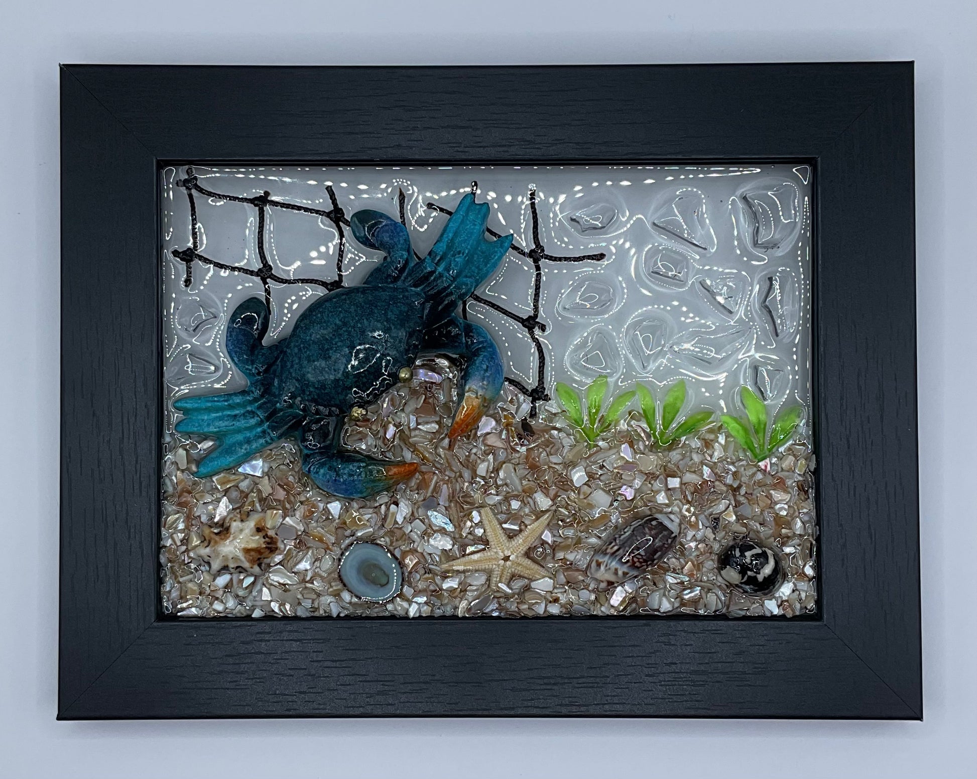 This 5x7 frame features a blue crab caught in netting, adorned with plant and shell accents. A whimsical addition to any home, it brings a touch of the seaside with its playful design.