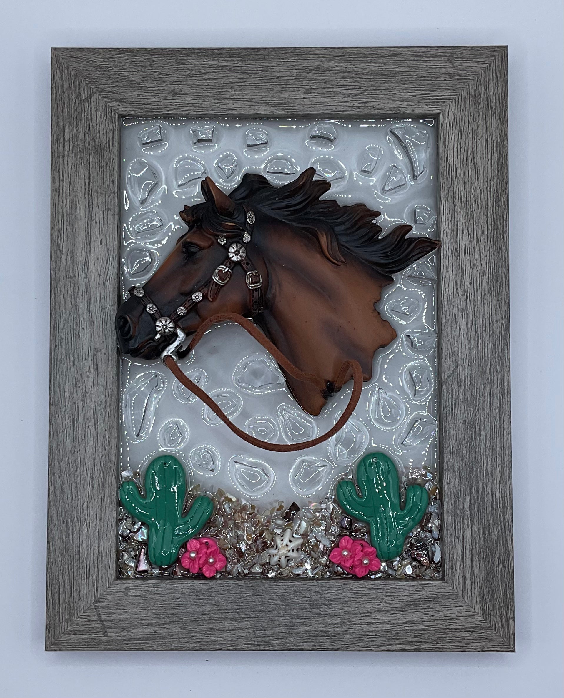 "Add some desert charm to your decor with this 5x7 horse frame, featuring a playful cactus and sandy accents. The brown horse and grey frame bring a unique touch to your home."